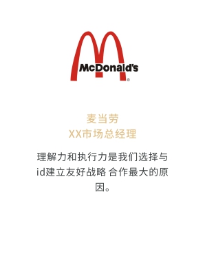 i-d先后經(jīng)歷與Audi、Mercedes-Benz、infiniti、PORSCHE、可口可樂、麥當(dāng)勞、肯德基、Budweiser、華為、小米、中國(guó)移動(dòng)、ELLE、L'OREAL、萬(wàn)達(dá)、仁恒置地、恒大、碧桂園、蘭桂坊...的業(yè)務(wù)合作,成功地將國(guó)際化的營(yíng)銷策劃理念及執(zhí)行方式融入本土,為更多的中國(guó)企業(yè)開啟全新的品牌推廣思路和執(zhí)行方案。